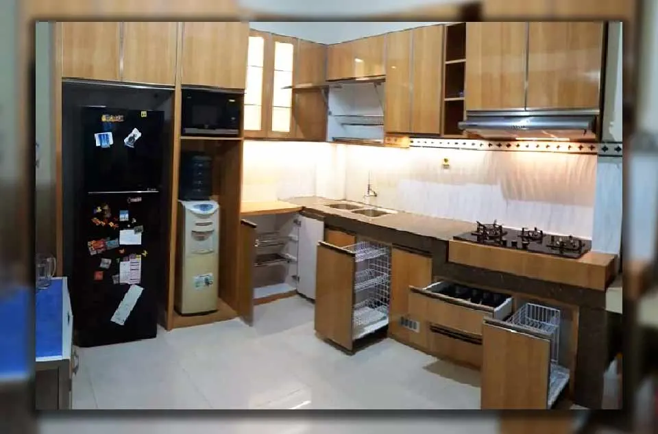 - Kitchen set letter L minimalis modern Cibubur : Ini adalah pilihan paling populer di rumah cluster. Model ini sangat efisien karena memanfaatkan sudut ruang dan sering menyatu dengan area mini bar minimalis menyatu kitchen set, menjadikannya pusat kegiatan informal.